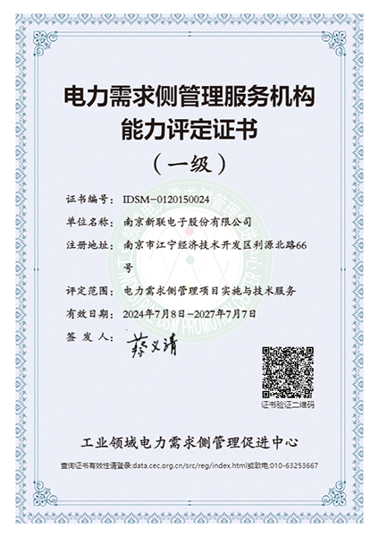 近日,南京新聯電子股份有限公司順利通過工業領域電力需求側管理促進中心能力評估審核,公司電力需求側管理服務機構能力評定證書(一級)成功換證,這是對新聯電子在電力需求側領域服務能力和技術實力的充分肯定。